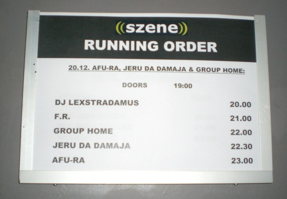 Als ich Ende November erfuhr, dass Old School-Rap-Größen wie Jeru Da Damaja, Group Home und Afu-Ra nach Wien kommen würden, wusste ich, dass ich dabei sein musste. Da ich Afu-Ra schon mal im Wiener Flex erleben durfte (ich glaube es war 2003) und er damals das Publikum wirklich zum Ausflippen brachte, konnte ich es kaum erwarten ihn wieder zu sehen.